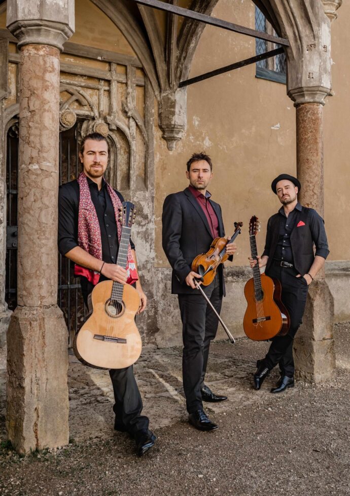 Die Gitarrensaiten glühen, der Geiger verzaubert mit atemberaubender Virtuosität auf der Violine: Mit der Energie ihrer Kompositionen zieht das Wiener Trio seit Jahren weltweit das Publikum in seinen Bann.
